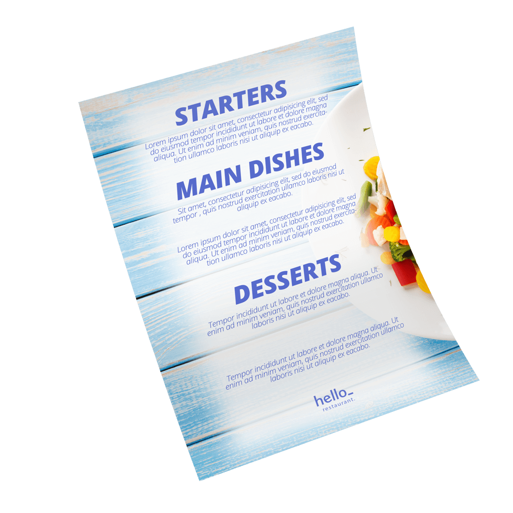 De ongevouwen menukaarten van GR Drukkerij zijn een tijdloze manier om jouw menu te presenten. Ga voor enkel- of dubbelzijdige bedrukking en kies tussen 11 formaten en 4 verschillende afwerkingen om aan te sluiten bij jouw unieke stijl. Je zit altijd goed met deze klassieke menukaarten!